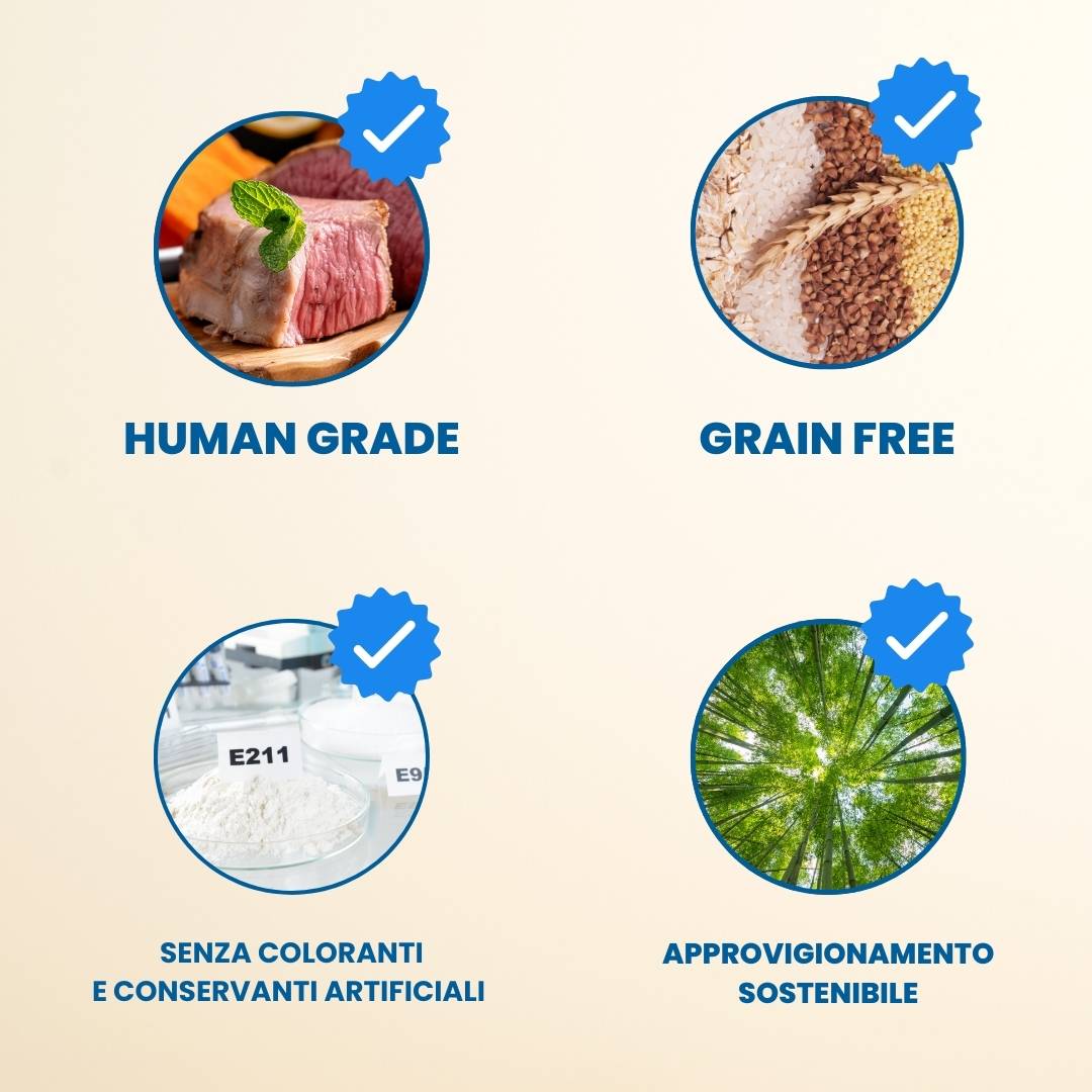 Le nostre ricette sono 100% Grain Free, con ingredienti Human Grade per una qualità superiore.