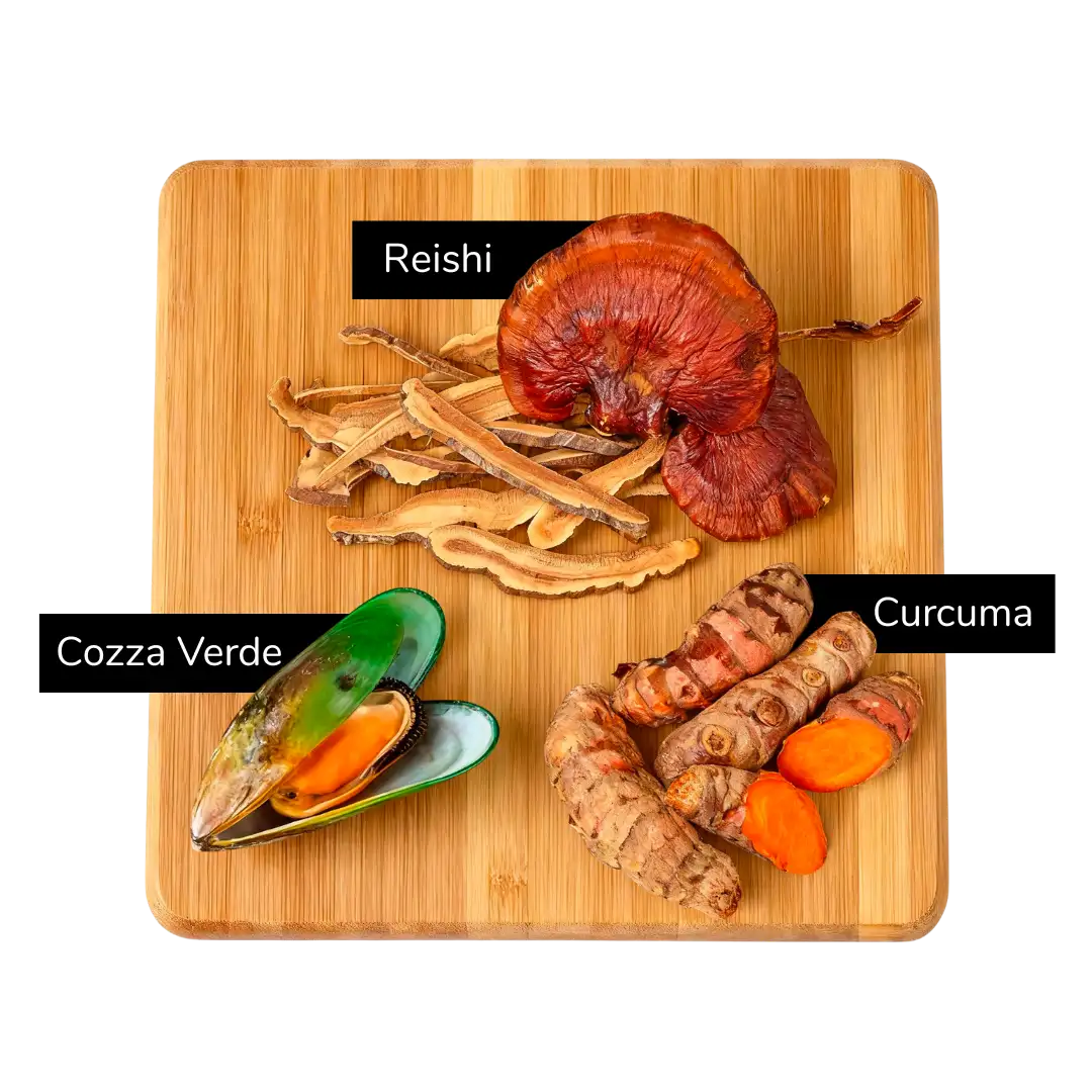 Glucosamina solfato 14%, MSM Metilsulfonilmetano 14%, Proteine animali idrolizzate (pollo), Condroitina solfato 5,3%, Fitosteroli di avocado e soia insaponificabili 4,9%, Ganoderma lucidum (Reishi) polvere 4%, Polvere di carruba (Ceratonia siliqua L.) 3%, Fosfato dicalcico, Chitosano (ottenuto per idrolisi alcalina della chitina da esoscheletro di crostacei) 2%, Olio di pesce 1%, Sale di magnesio dell'acido stearico, Farina di molluschi (Perna canaliculus), Lievito (lievito essicato Saccharomyces cerevisiae), Acido Ialuronico, Piper nigrum polvere, Spirea ulmaria polvere.